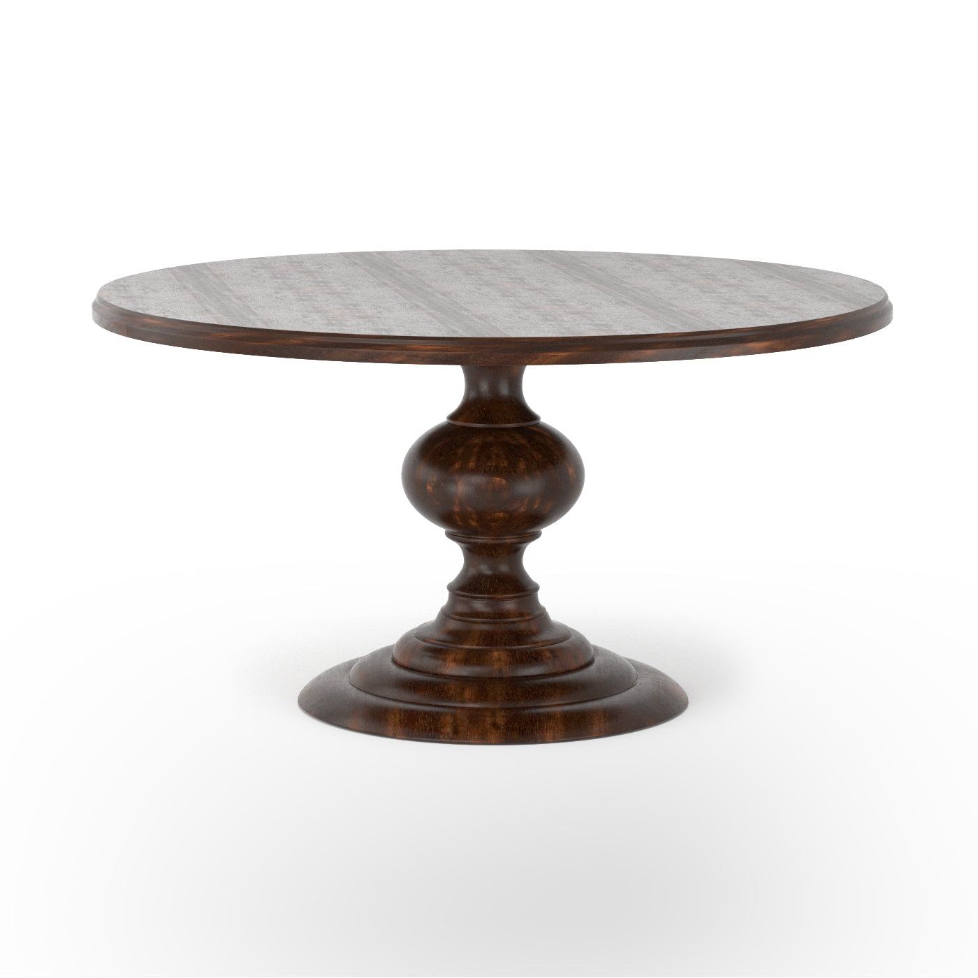 A round of classic farmhouse elegance. Stepped base, turned mango wood pedestal, and round top are wire-brushed and finished in a dark oak stain.