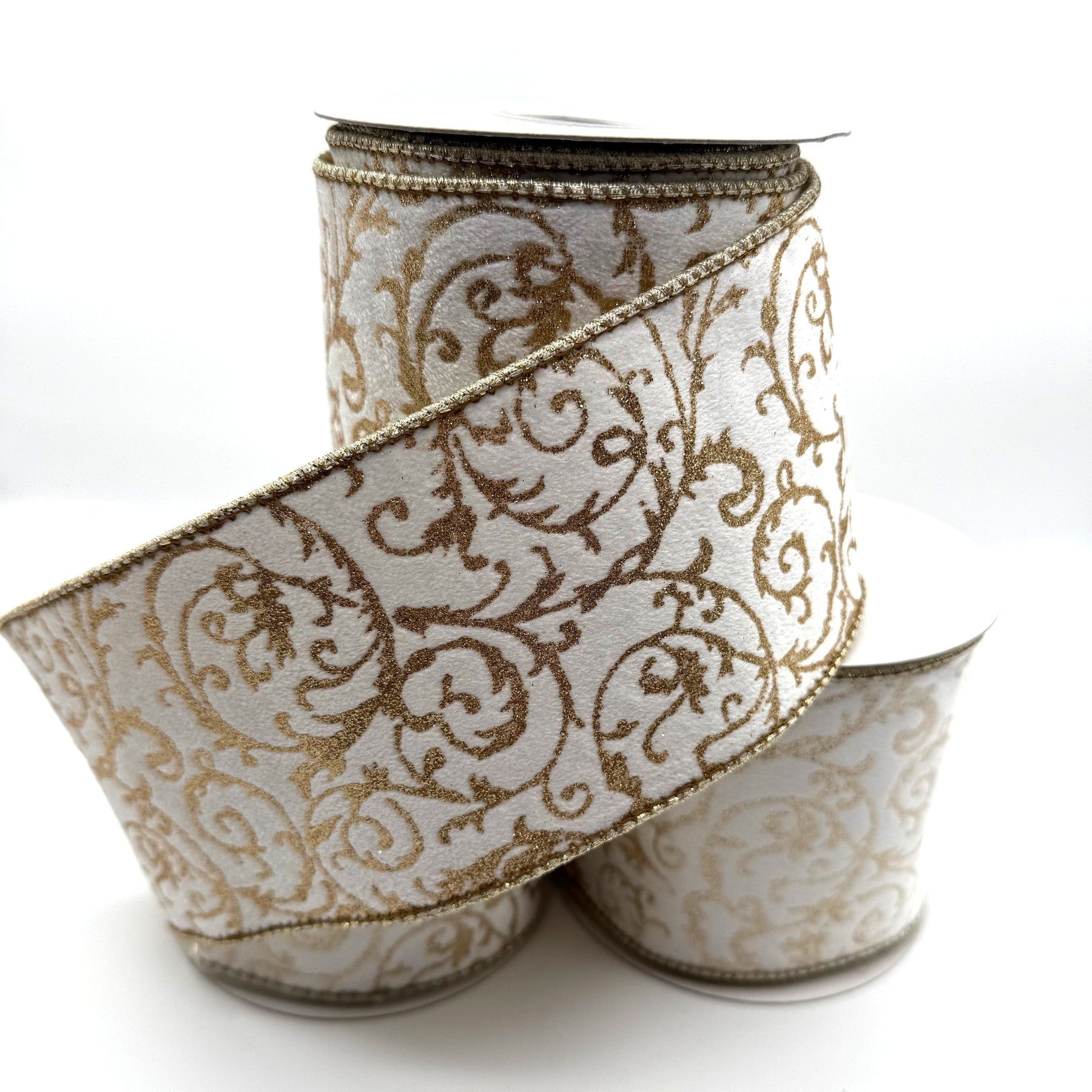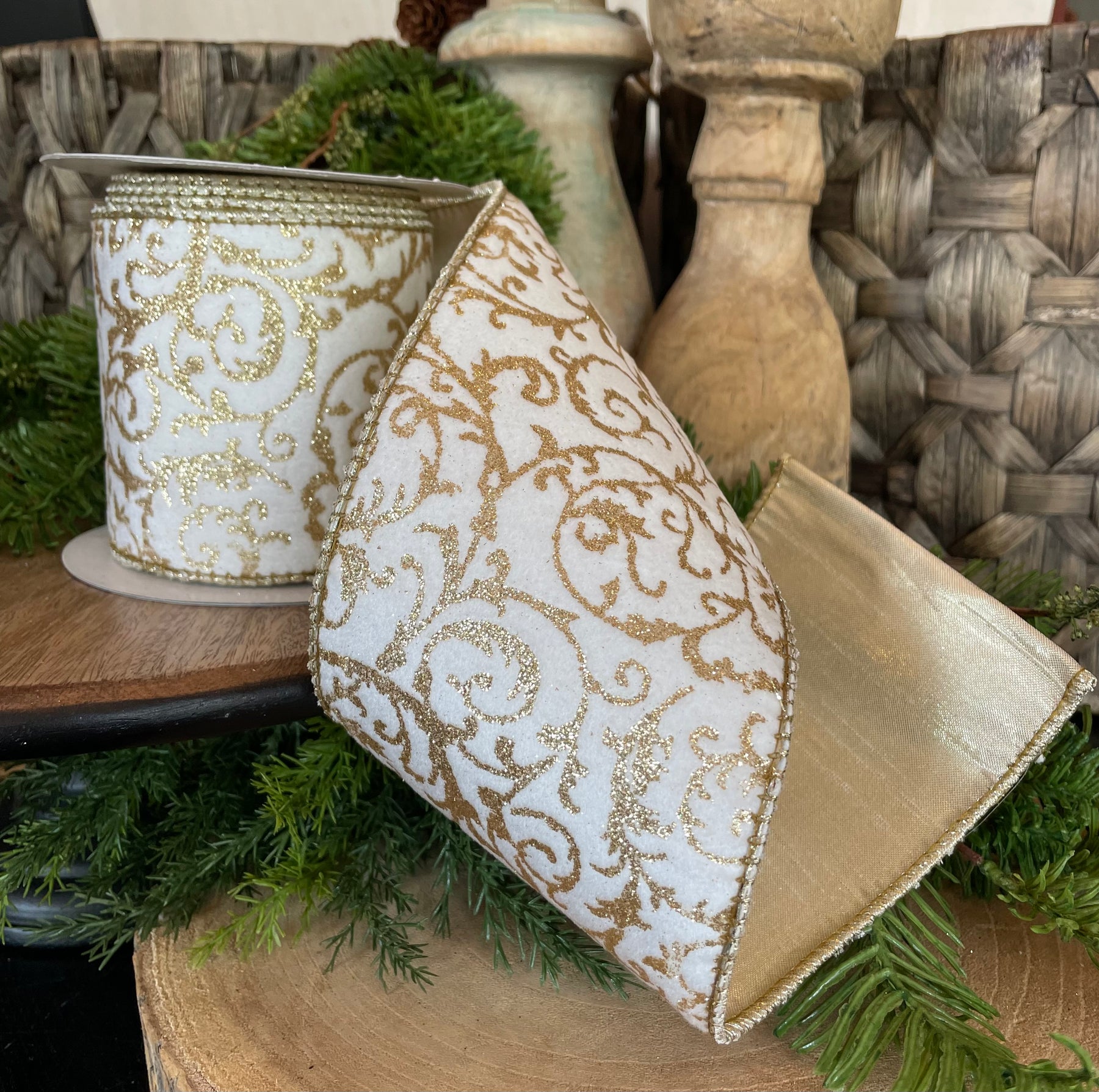 4" x 5 YDS Glitter Filigree Velvet & Metallic Gold Ribbon
