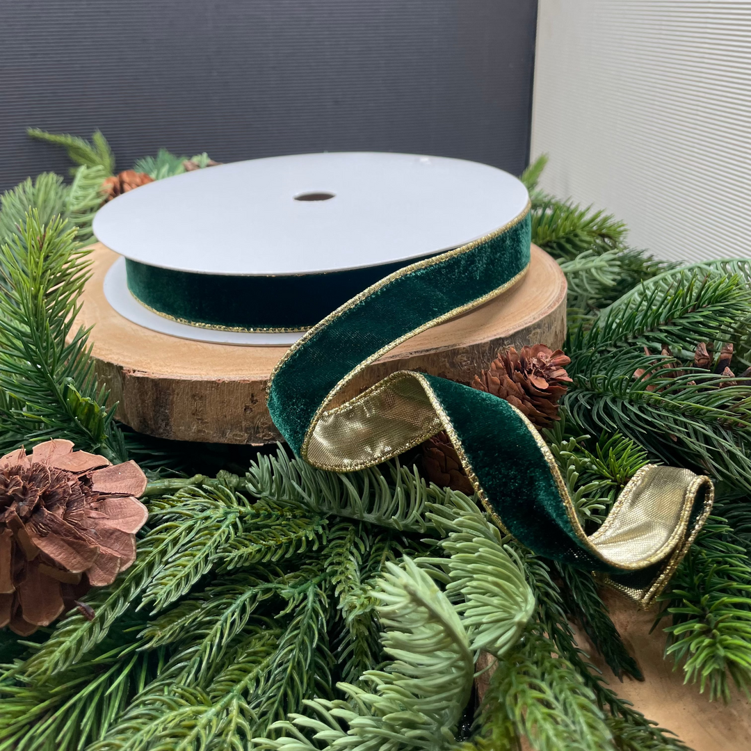 1"x20Y Wired Velvet Ribbon with Metallic Edge Green